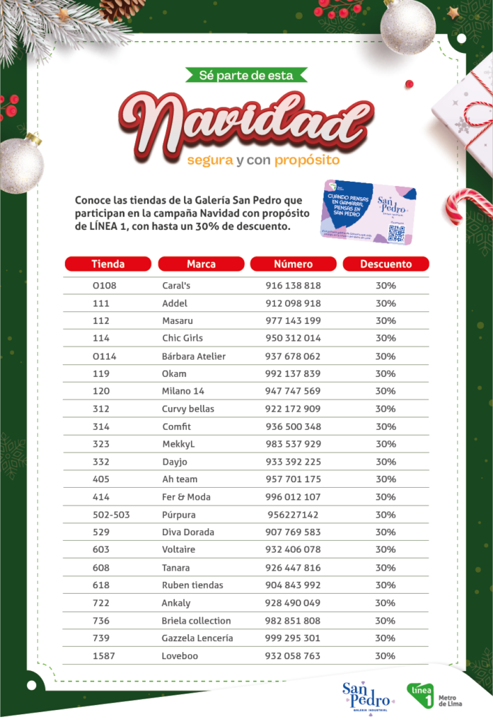Conoce las tiendas de la Galería San Pedro que participan en la campaña Navidad con propósito de LÍNEA 1, con hasta un 30% de descuento en productos seleccionados.